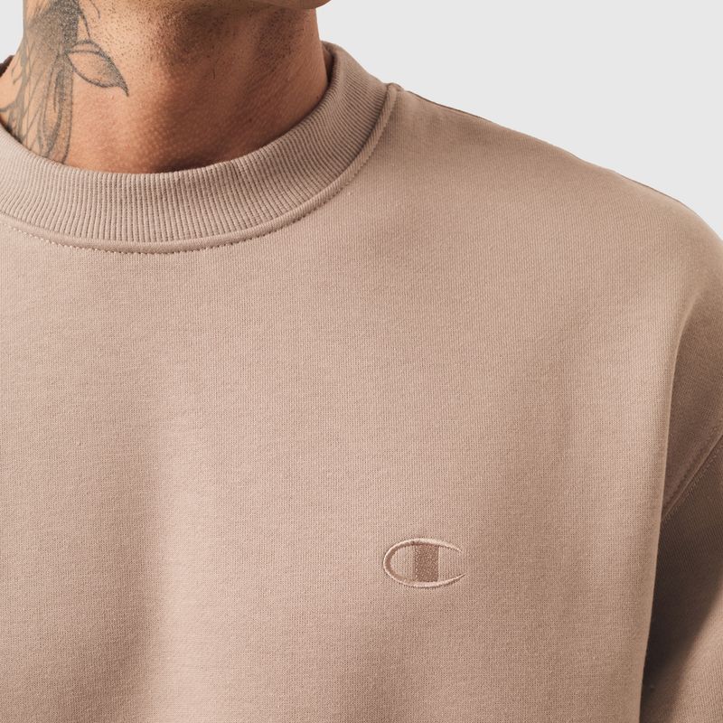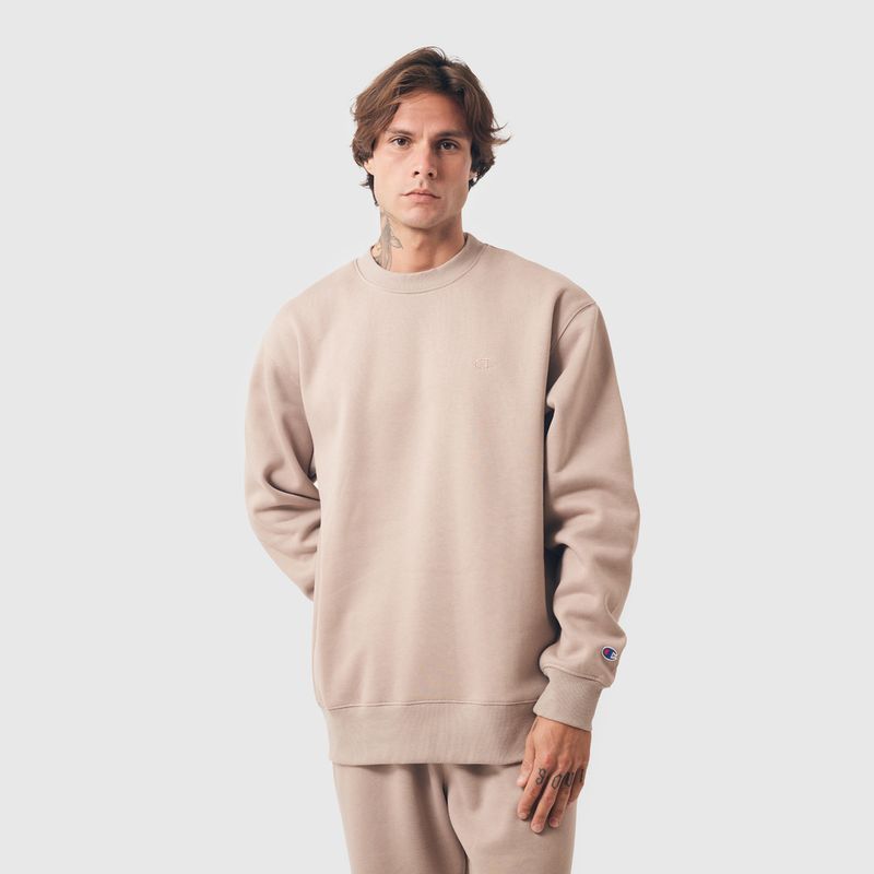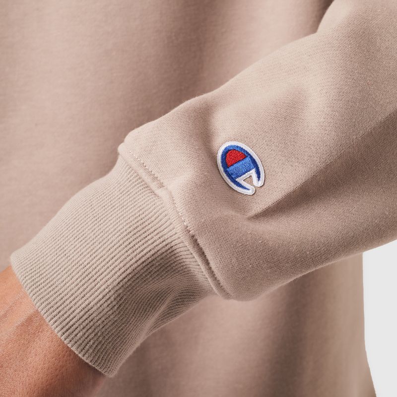 O moletom Champion possui modelagem regular da linha Athletic e é confeccionado em malha mista de algodão e poliéster com alta gramatura (320g). Conta com gola de 2.5cm e costuras reforçadas, que garantem durabilidade e resistência mesmo após diversas lavagens, além de proporcionar um visual alinhado. O logo é bordado no peito, e o icônico na manga assegura a autenticidade da peça, complementando seu design.