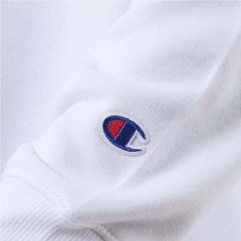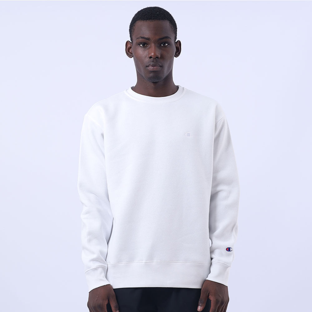 O moletom Champion possui modelagem regular da linha e é confeccionado em malha mista de algodão e poliéster com alta gramatura (320g). Conta com gola de 2.5cm e costuras reforçadas, que garantem durabilidade e resistência mesmo após diversas lavagens, além de proporcionar um visual alinhado. O logo é bordado no peito, e o icônico na manga assegura a autenticidade da peça, complementando seu design.