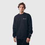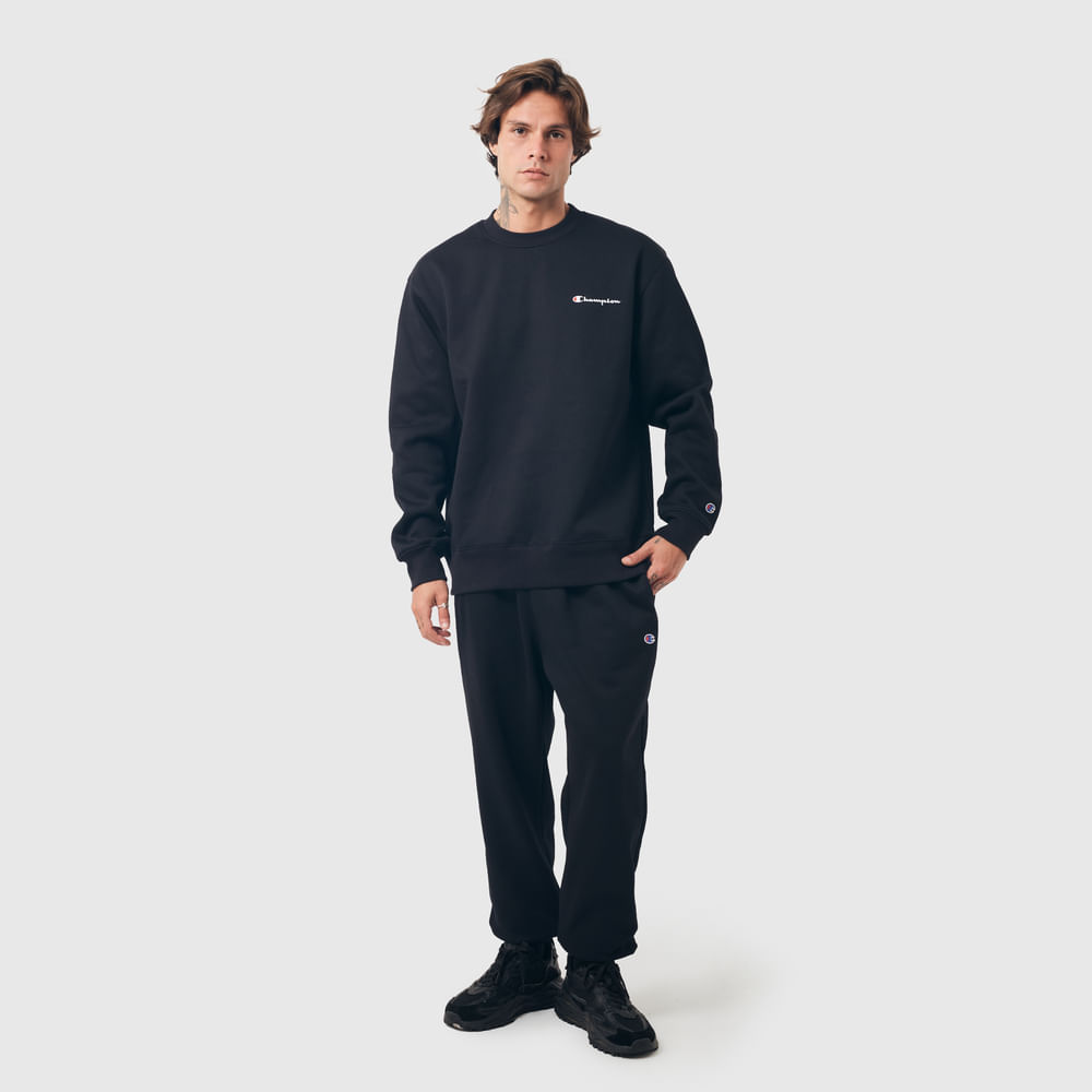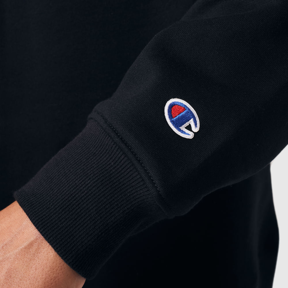 O moletom Champion possui modelagem regular da linha e é confeccionado em malha mista de algodão e poliéster com alta gramatura (320g). Conta com gola de 2.5cm e costuras reforçadas, que garantem durabilidade e resistência mesmo após diversas lavagens, além de proporcionar um visual alinhado. O logo é bordado no peito, e o icônico na manga assegura a autenticidade da peça, complementando seu design.