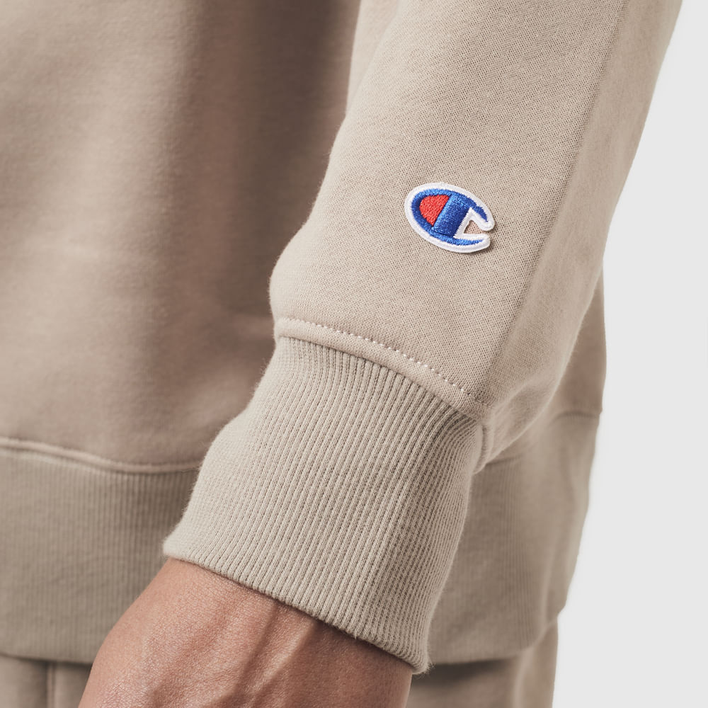 O moletom Champion possui modelagem regular da linha e é confeccionado em malha mista de algodão e poliéster com alta gramatura (310g). Conta com gola de 2.5cm e costuras reforçadas, que garantem durabilidade e resistência mesmo após diversas lavagens, além de proporcionar um visual alinhado. O logo em silk no peito, e o icônico na manga assegura a autenticidade da peça, complementando seu design.