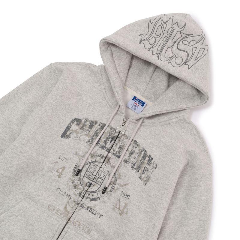 A collab, que já se tornou um marco no streetwear brasileiro, apresenta uma coleção que re-interpreta o legado de sportswear centenário da Champion com a linguagem contemporânea da Sufgang. Peças com inspiração “college”, gráficos sombrios e tipografia gótica estampam camisetas, moletons, calças, bermudas, boné, com uma paleta de cores sóbria: preto, branco e mescla. As peças tem decorações bordadas e silkadas com a técnica já característica da Sufgang de "glow in the dark”.