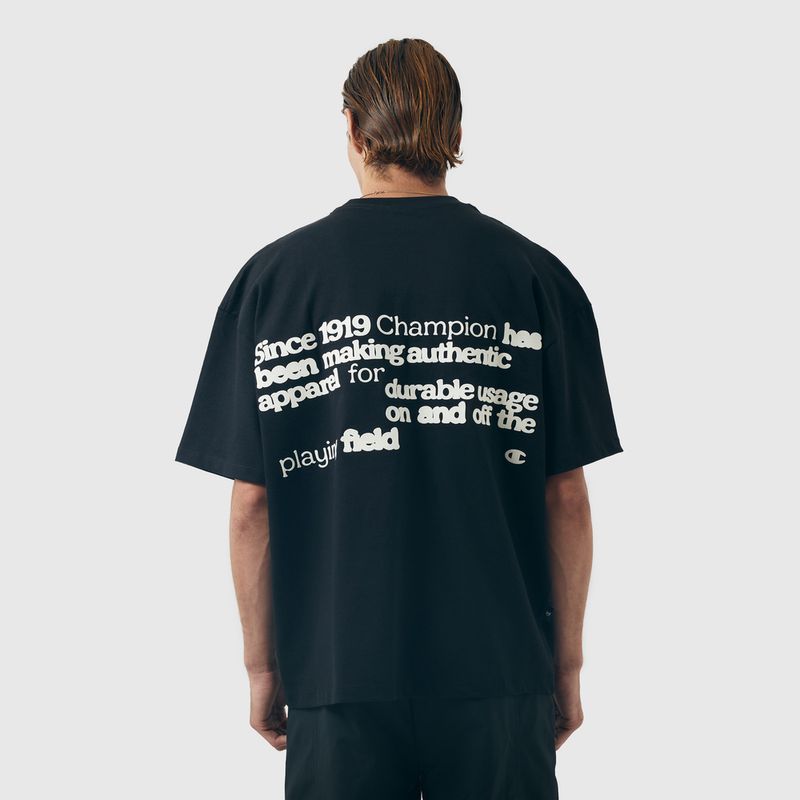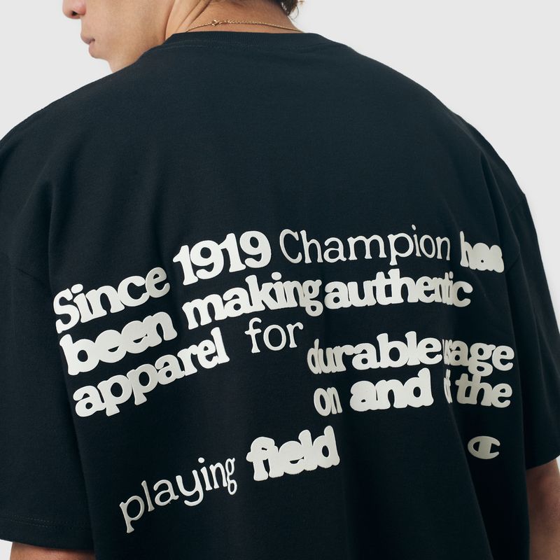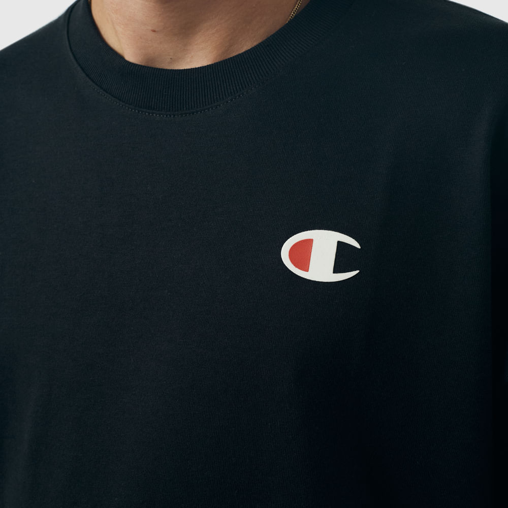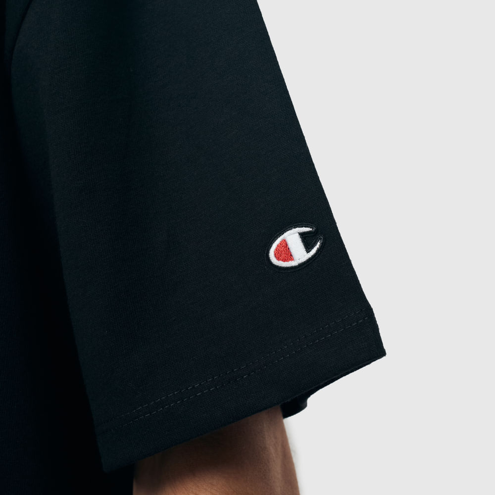 A camiseta Champion possui modelagem boxy da linha Life, confeccionada em malha pesada de algodão com alta gramatura (250g). Sua gola sobreposta de 2,5 cm garante durabilidade e resistência mesmo após diversas lavagens, além de proporcionar um visual estruturado e alinhado. A estampa vem em silk no peito, e o icônico " C Patch" aplicado lateralmente na manga assegura a autenticidade e complementa o design clássico da peça.