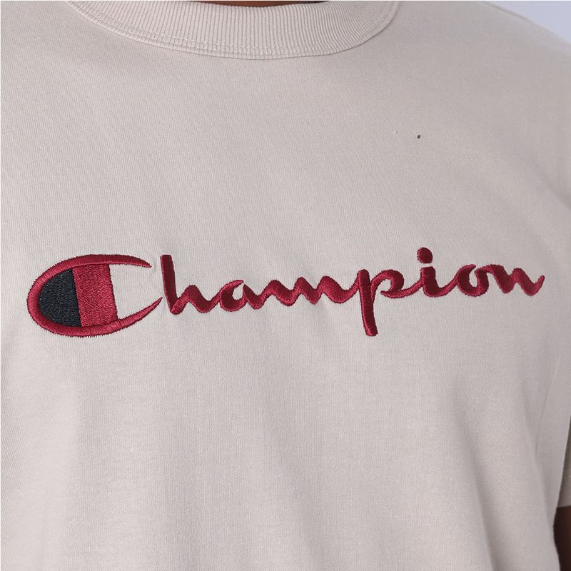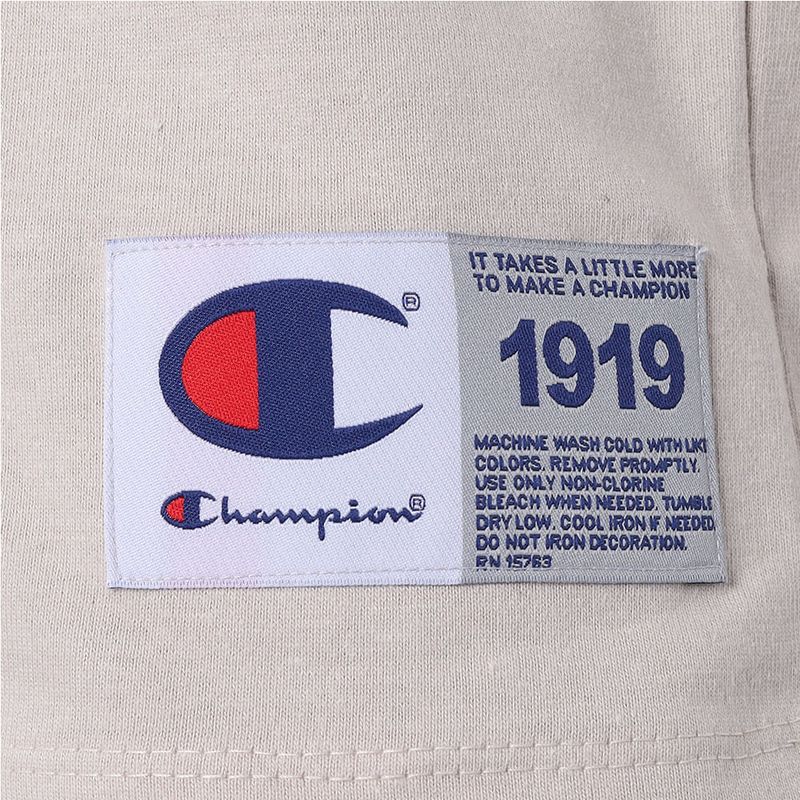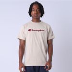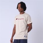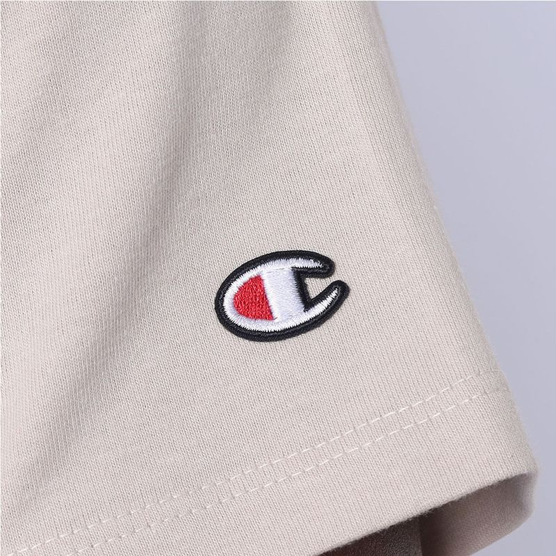 A camiseta Champion possui modelagem regular da linha Life, confeccionada em malha pesada de algodão com alta gramatura (250g). Sua gola sobreposta de 2,5 cm garante durabilidade e resistência mesmo após diversas lavagens, além de proporcionar um visual estruturado e alinhado. A estampa é bordada no peito, e o icônico "C Patch" aplicado lateralmente na manga assegura a autenticidade e complementa o design clássico da peça.