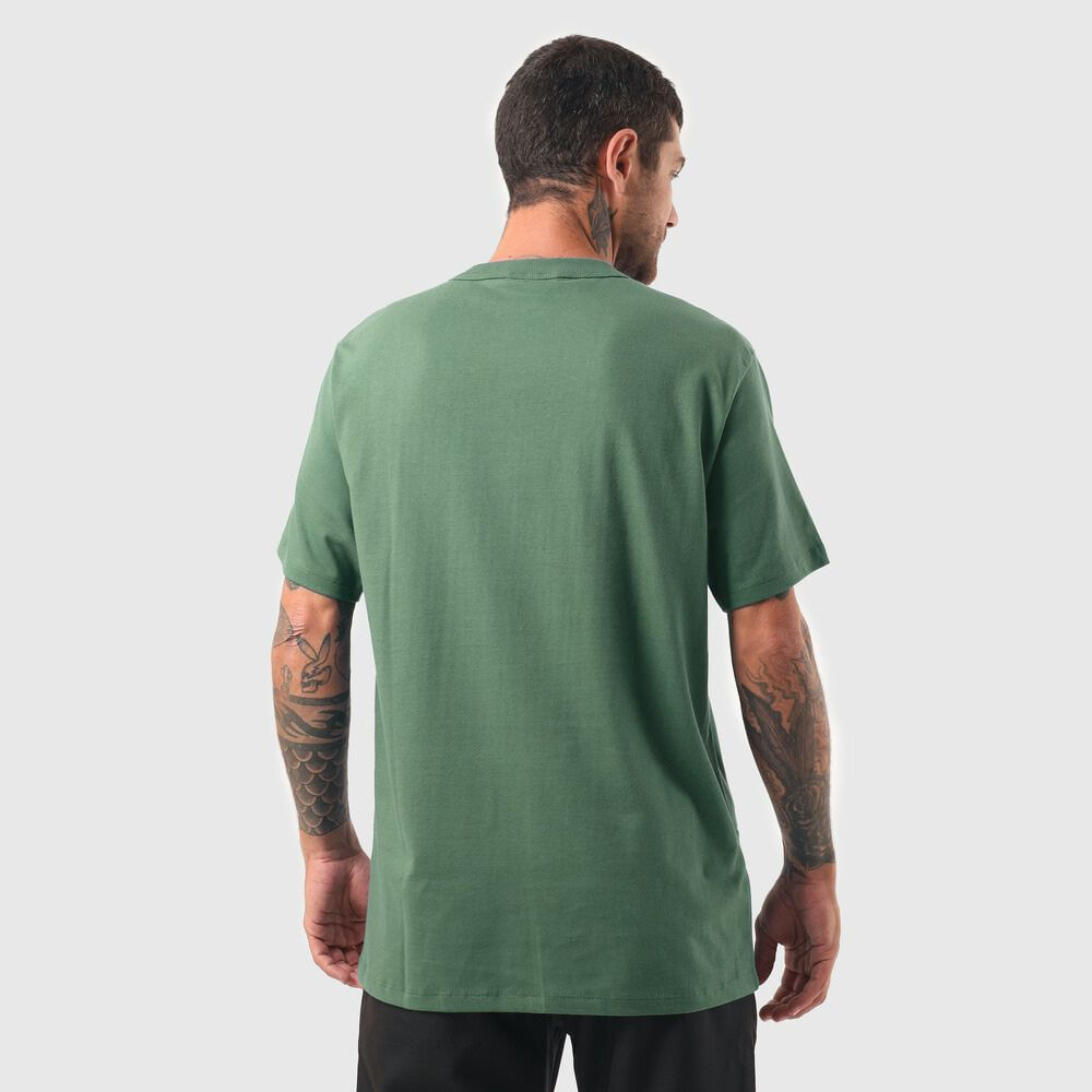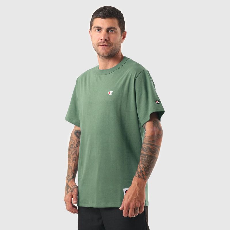 A camiseta Champion possui modelagem regular da linha Life, confeccionada em malha pesada de algodão com alta gramatura (250g). Sua gola sobreposta de 2,5 cm garante durabilidade e resistência mesmo após diversas lavagens, além de proporcionar um visual estruturado e alinhado. A estampa é bordada no peito, e o icônico "C Patch" aplicado lateralmente na manga assegura a autenticidade e complementa o design clássico da