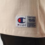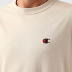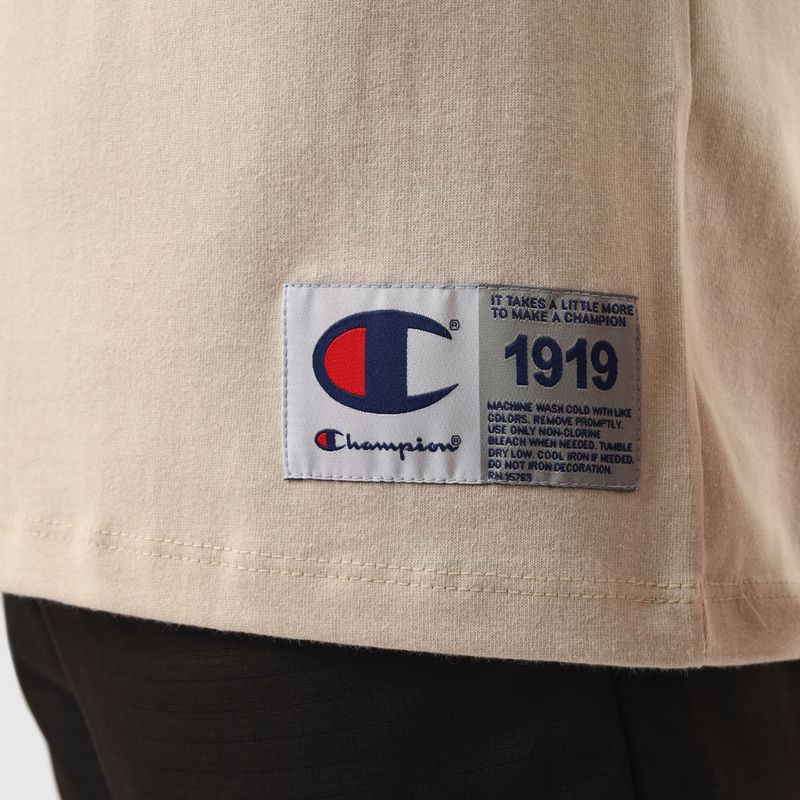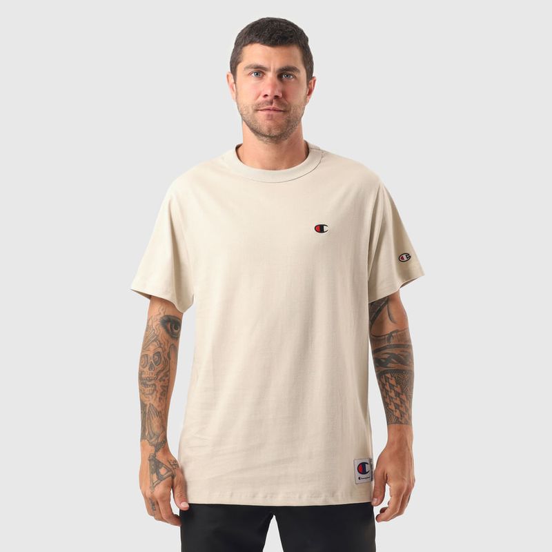 A camiseta Champion possui modelagem regular da linha Life, confeccionada em malha pesada de algodão com alta gramatura (250g). Sua gola sobreposta de 2,5 cm garante durabilidade e resistência mesmo após diversas lavagens, além de proporcionar um visual estruturado e alinhado. A estampa é bordada no peito, e o icônico "C Patch" aplicado lateralmente na manga assegura a autenticidade e complementa o design clássico da