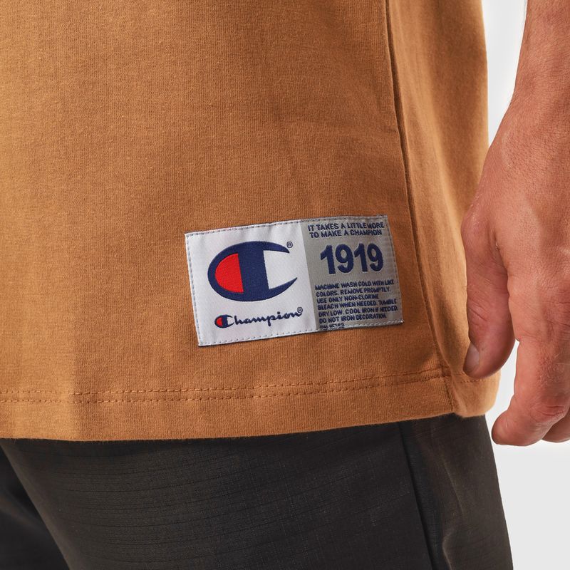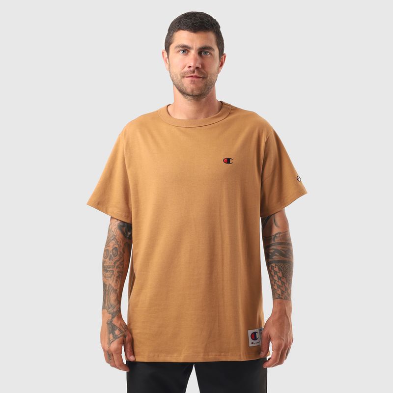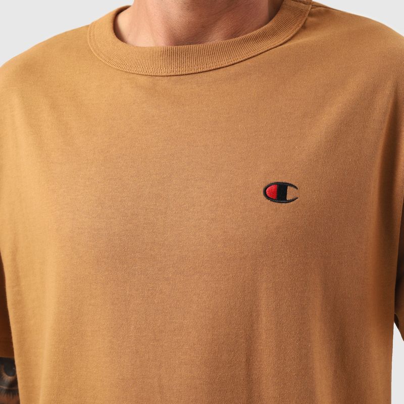 A camiseta Champion possui modelagem regular da linha Life, confeccionada em malha pesada de algodão com alta gramatura (250g). Sua gola sobreposta de 2,5 cm garante durabilidade e resistência mesmo após diversas lavagens, além de proporcionar um visual estruturado e alinhado. A estampa é bordada no peito, e o icônico "C Patch" aplicado lateralmente na manga assegura a autenticidade e complementa o design clássico da