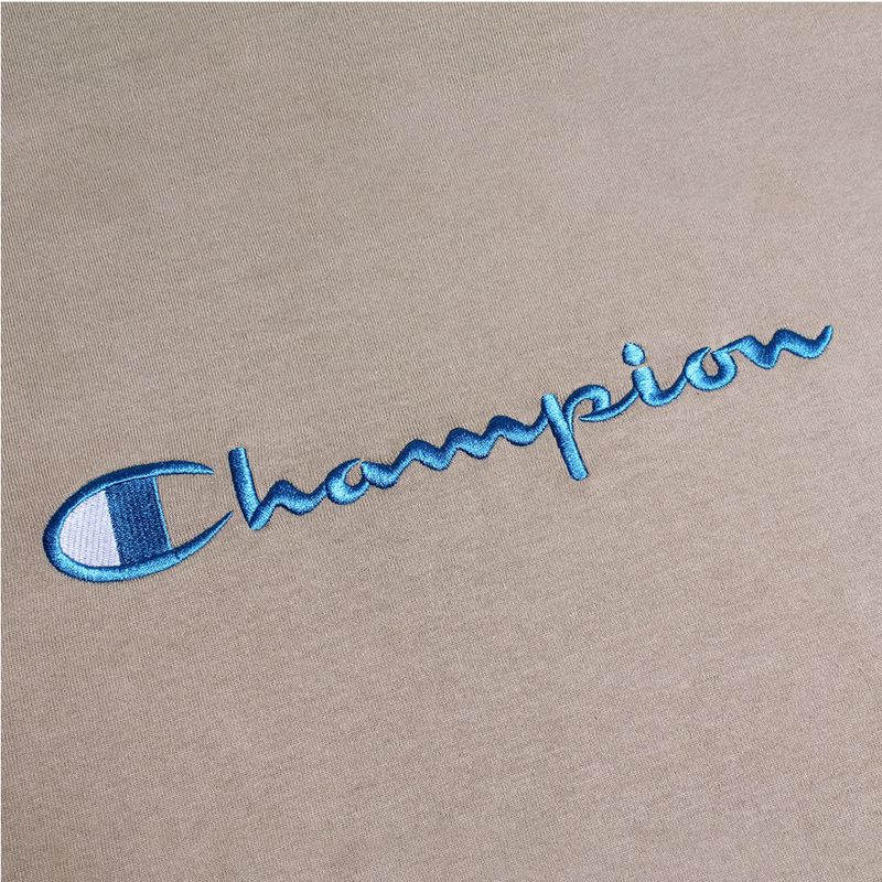 A camiseta Champion possui modelagem regular da linha Life, confeccionada em malha pesada de algodão com alta gramatura (250g). Sua gola sobreposta de 2,5 cm garante durabilidade e resistência mesmo após diversas lavagens, além de proporcionar um visual estruturado e alinhado. A estampa é bordada no peito, e o icônico "C Patch" aplicado lateralmente na manga assegura a autenticidade e complementa o design clássico da