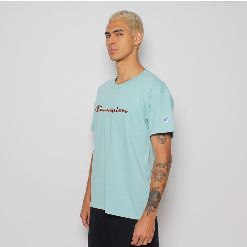 A camiseta Champion possui modelagem regular da linha Life, confeccionada em malha pesada de algodão com alta gramatura (250g). Sua gola sobreposta de 2,5 cm garante durabilidade e resistência mesmo após diversas lavagens, além de proporcionar um visual estruturado e alinhado. A estampa é bordada no peito, e o icônico "C Patch" aplicado lateralmente na manga assegura a autenticidade e complementa o design clássico da