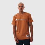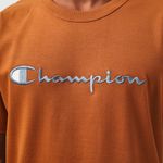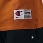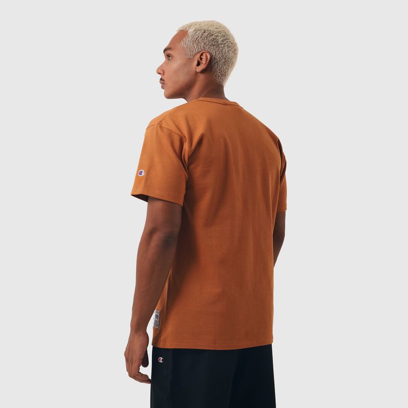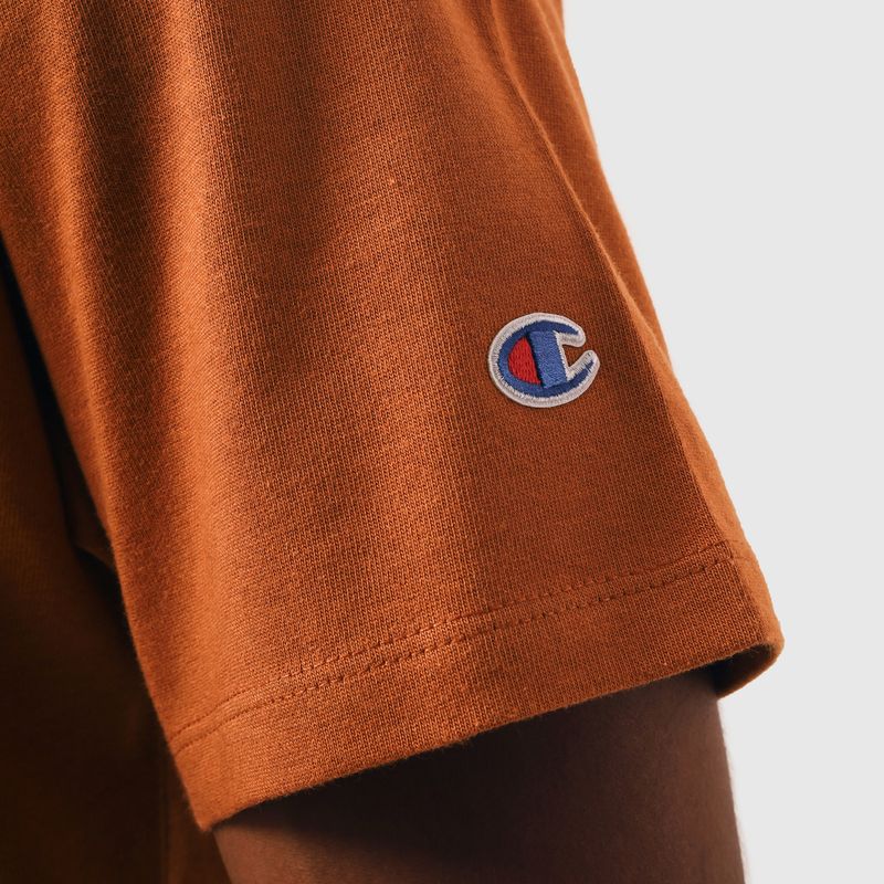 A camiseta Champion possui modelagem regular da linha Life, confeccionada em malha pesada de algodão com alta gramatura (250g). Sua gola sobreposta de 2,5 cm garante durabilidade e resistência mesmo após diversas lavagens, além de proporcionar um visual estruturado e alinhado. A estampa é bordada no peito, e o icônico "C Patch" aplicado lateralmente na manga assegura a autenticidade e complementa o design clássico da