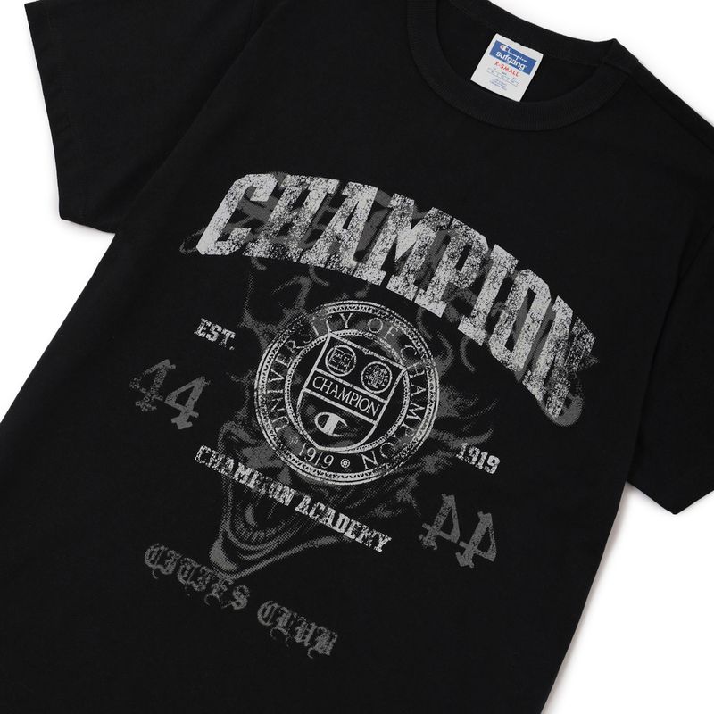 A collab, que já se tornou um marco no streetwear brasileiro, apresenta uma coleção que re-interpreta o legado de sportswear centenário da Champion com a linguagem contemporânea da Sufgang. Peças com inspiração “college”, gráficos sombrios e tipografia gótica estampam camisetas, moletons, calças, bermudas, boné, com uma paleta de cores sóbria: preto, branco e mescla. As peças tem decorações bordadas e silkadas com a técnica já característica da Sufgang de "glow in the dark”.