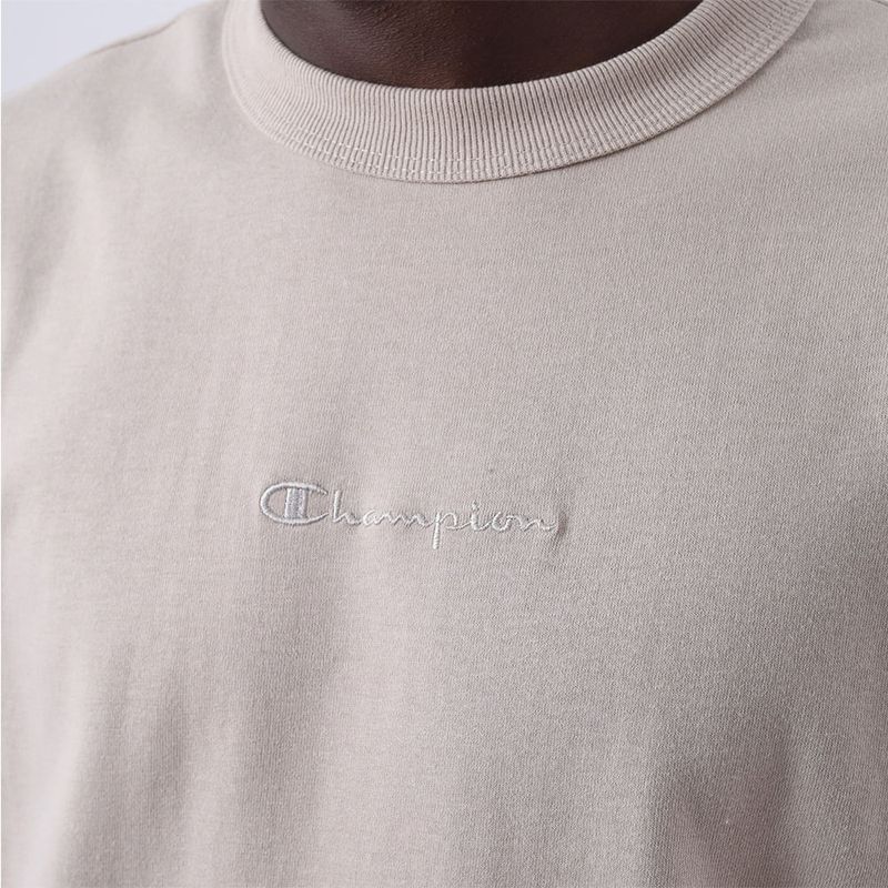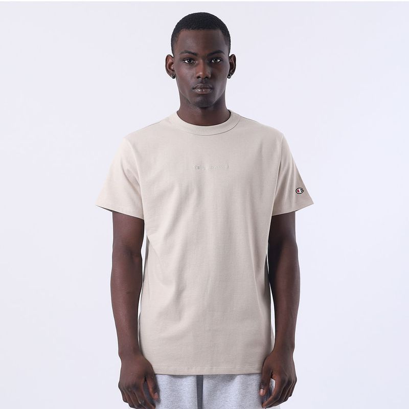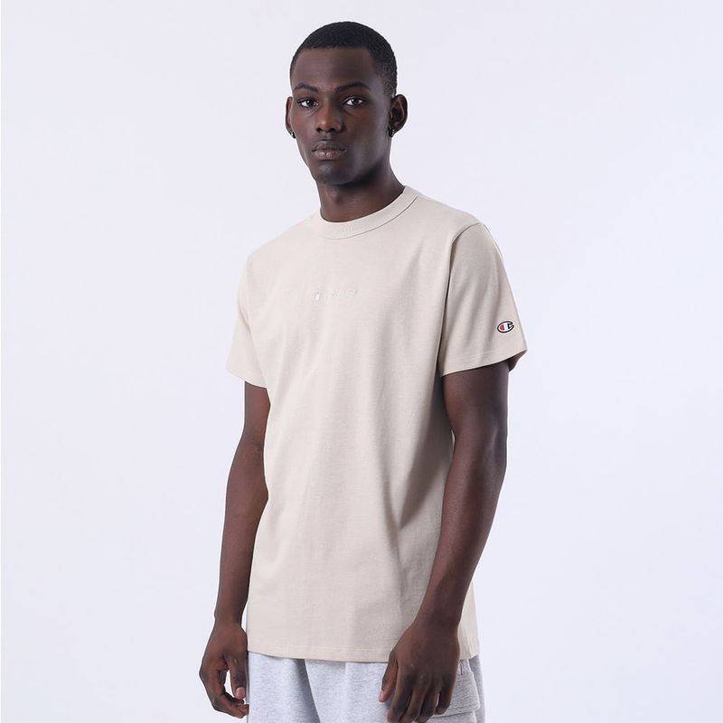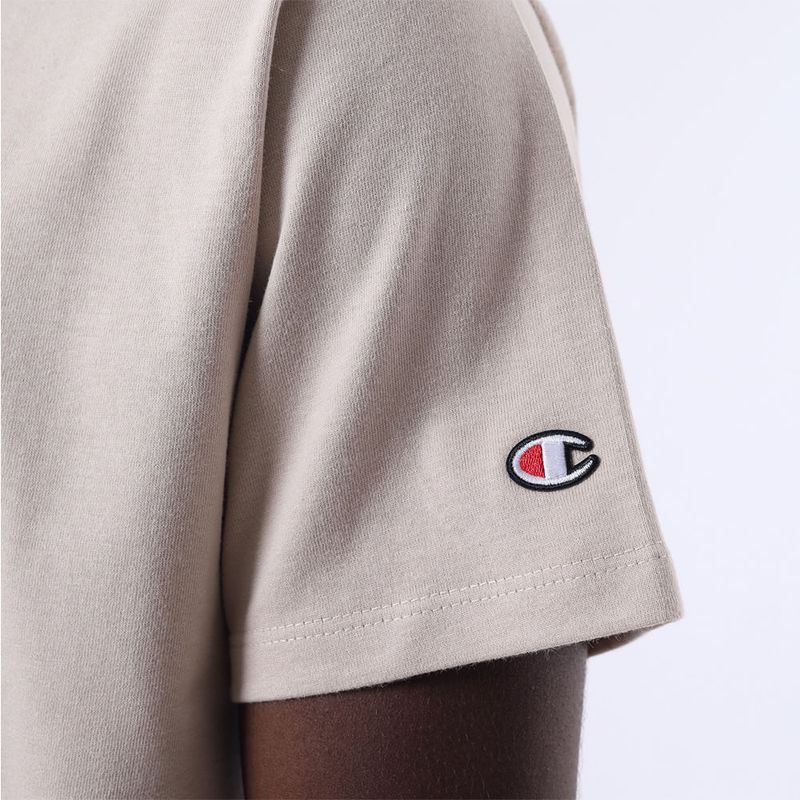 A camiseta Champion possui modelagem regular da linha Life, confeccionada em malha pesada de algodão com alta gramatura (250g). Sua gola sobreposta de 2,5 cm garante durabilidade e resistência mesmo após diversas lavagens, além de proporcionar um visual estruturado e alinhado. O logo vem bordado no peito, e o icônico "C Patch" aplicado lateralmente na manga assegura a autenticidade e complementa o design clássico da peça.