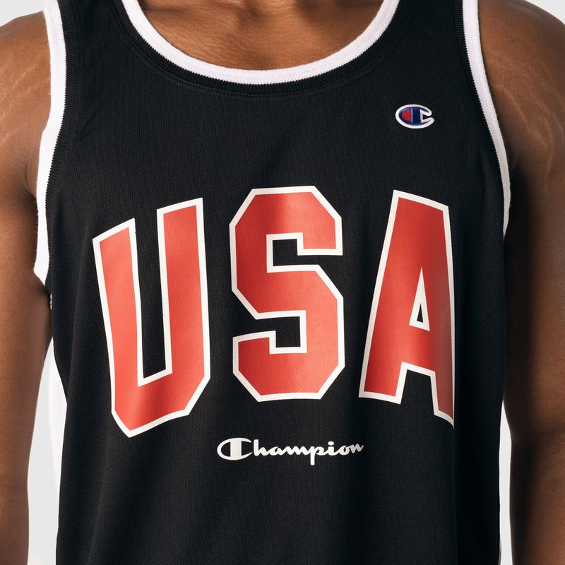 Identidade Champion – Logo bordado e estampa retro inspirada nos uniformes clássicos da NBA.