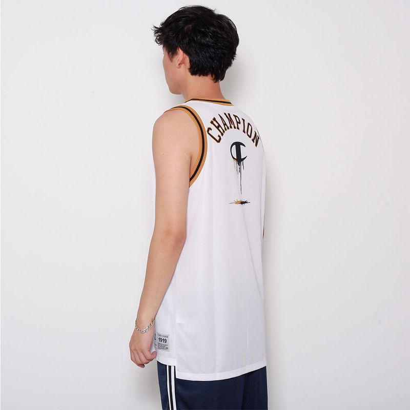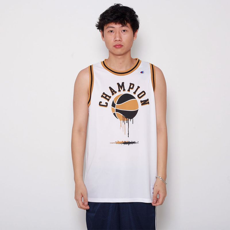 Identidade Champion – Logo bordado e estampa retro inspirada nos uniformes clássicos da NBA.