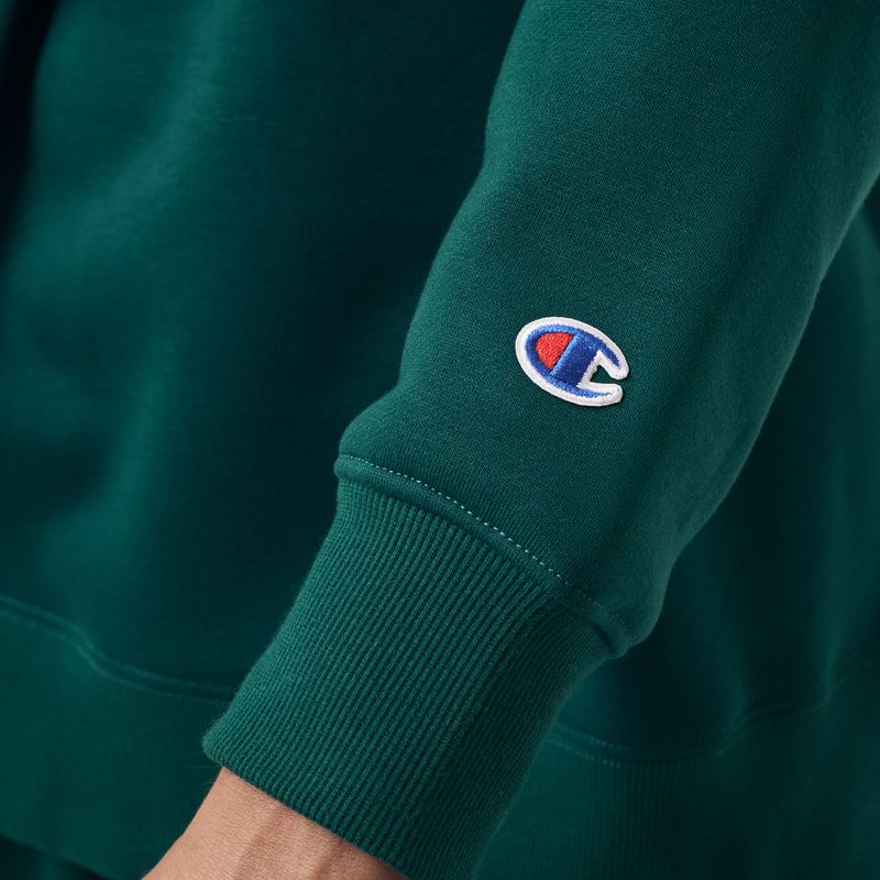 O moletom Champion possui modelagem regular da linha e é confeccionado em malha mista de algodão e poliéster com alta gramatura (320g). Conta com gola de 2.5cm e costuras reforçadas, que garantem durabilidade e resistência mesmo após diversas lavagens, além de proporcionar um visual alinhado. O logo é bordado no peito, e o icônico na manga assegura a autenticidade da peça, complementando seu design.